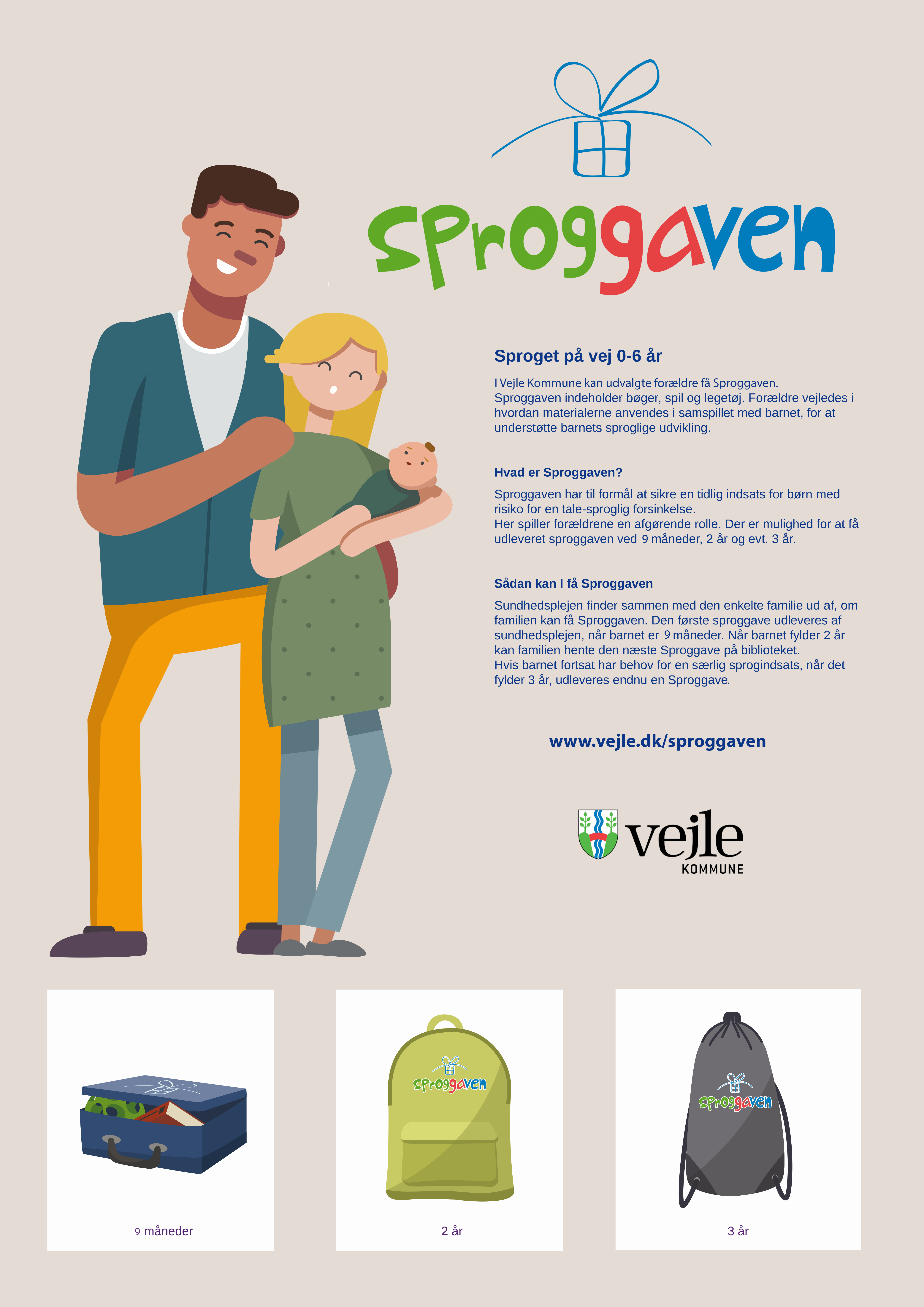 Sproggaven er et tilbud til udvalgte forældre og deres barn, som indeholder bøger, spil, sange og legetøj, der kan understøtte forældre med at udvikle barnets tale- og sprogfærdigheder. Pt. er Sproggaven et piltotprojekt målrettet børn i området Løget og Nørremarken i Vejle.