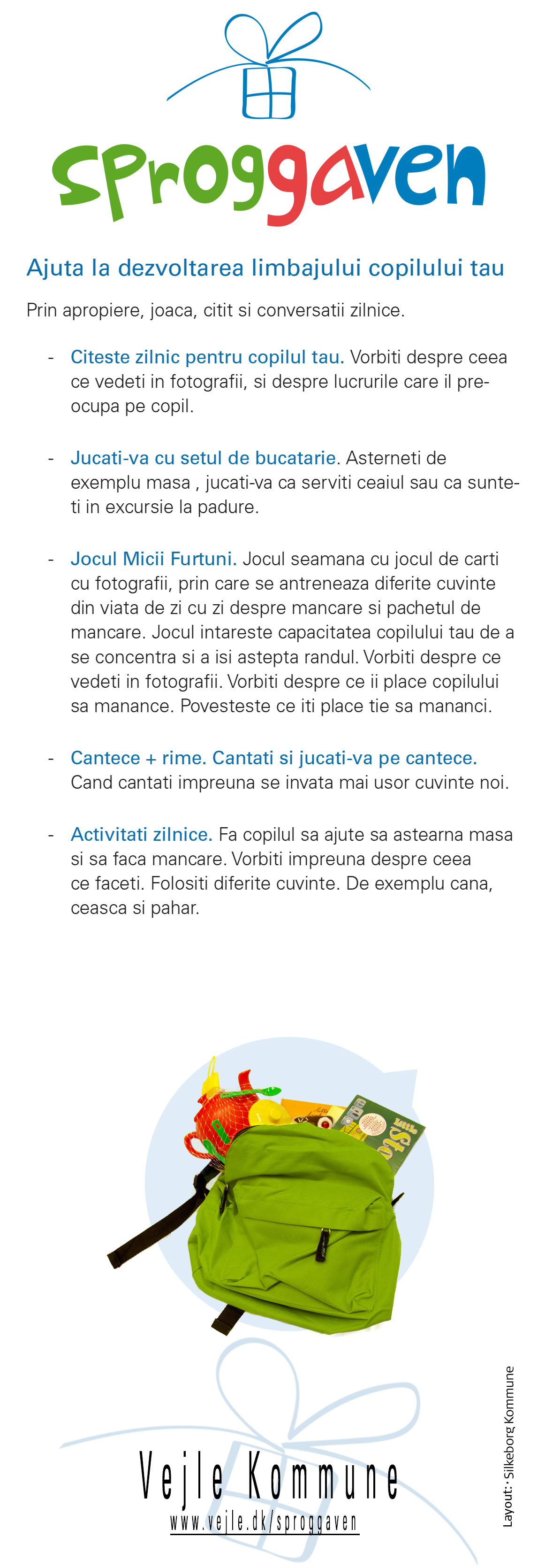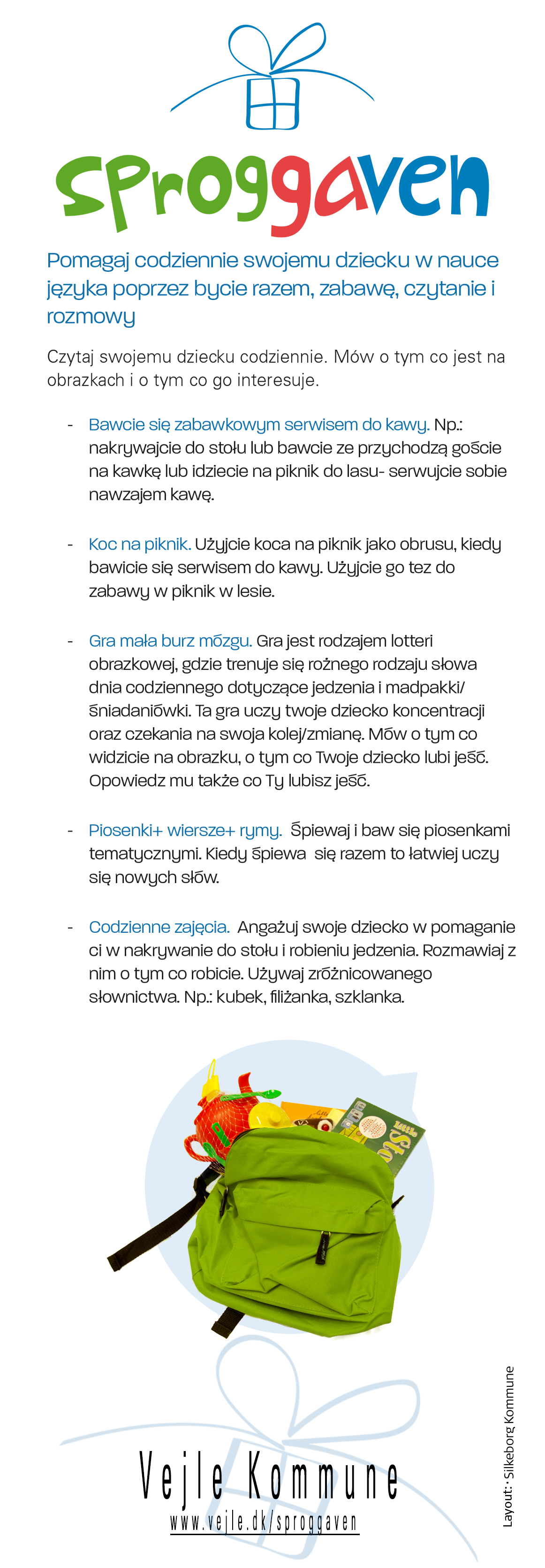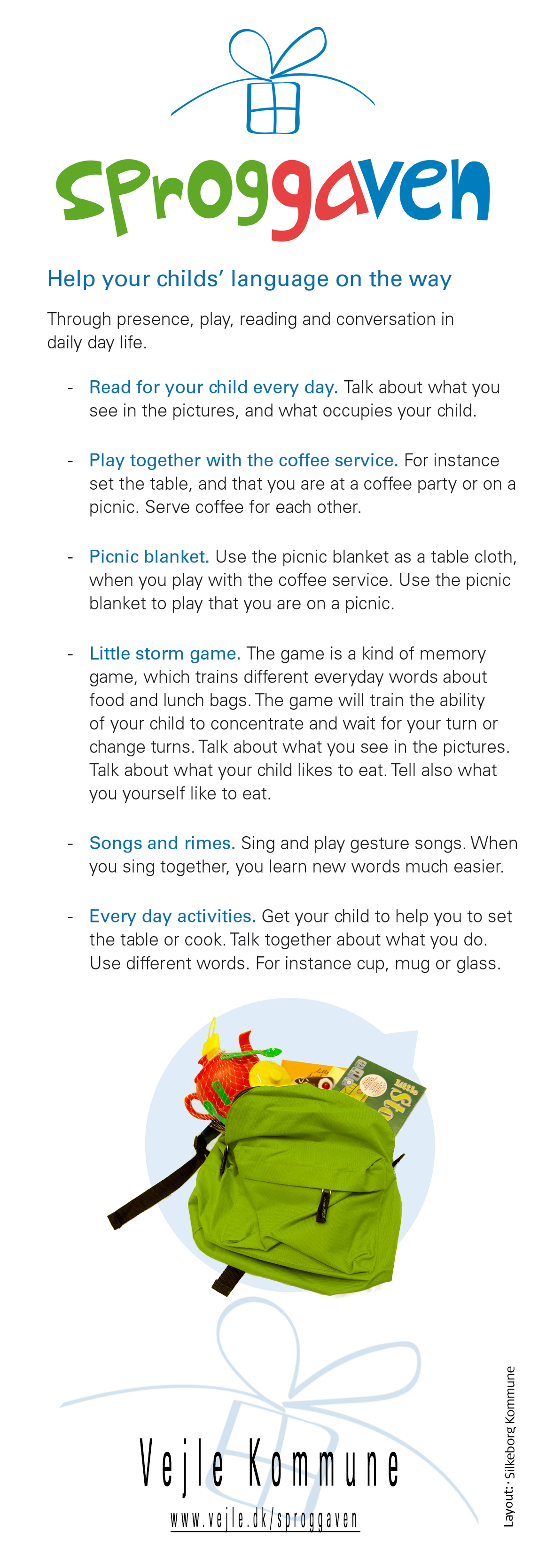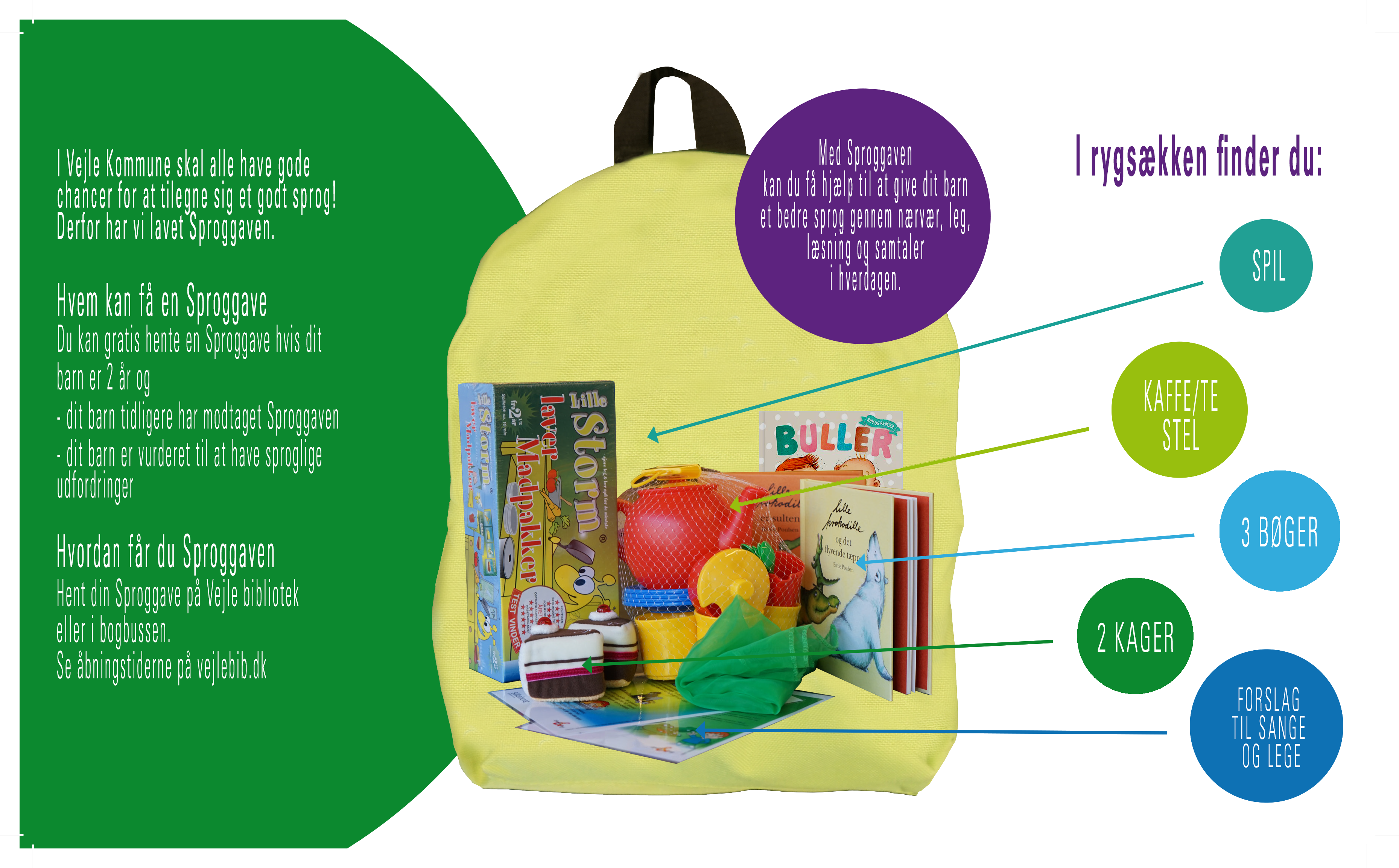 Materiale fra Sproggaven til dit barn på 2 år. Rygsækken bliver som udgangspunkt udleveret af biblioteket og kan bruges til at styrke børns sprog og give dem mange gode sprogoplevelser.