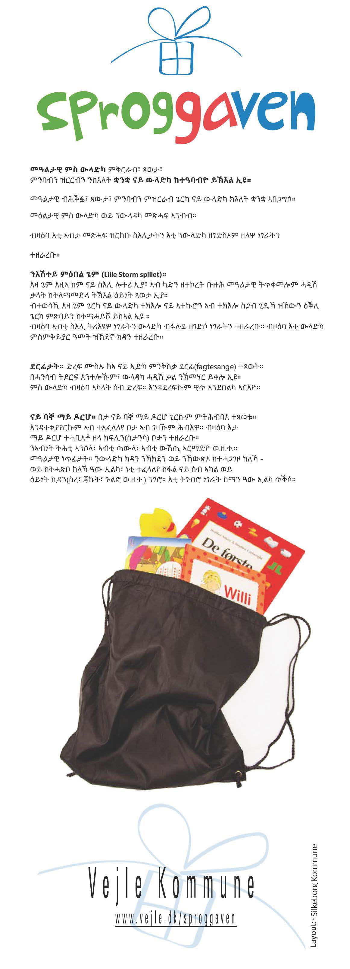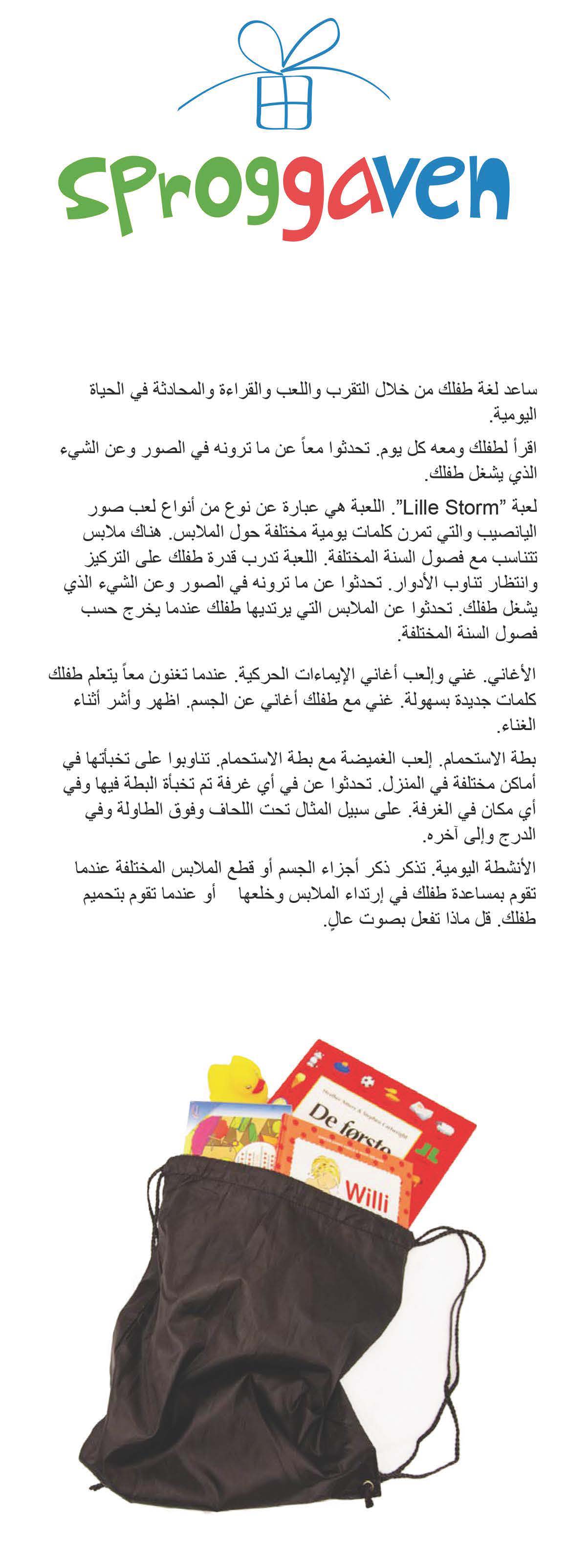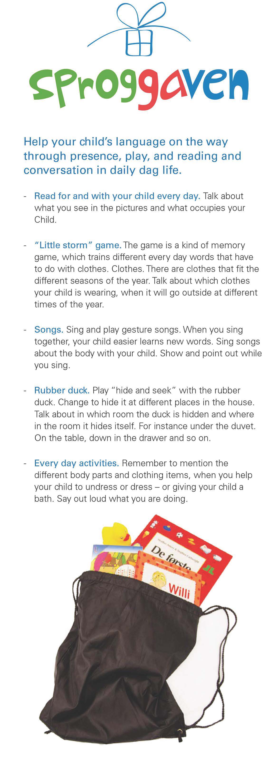 Materiale til dit barn fra Sproggaven ved 3 år. Tasken bliver udleveret i børnehaven og har til formål at styrke sproget hos børn, ved hjælp af de sprogstimulerende materialer.