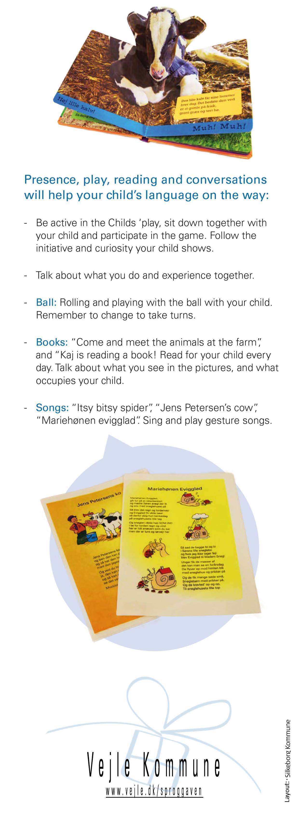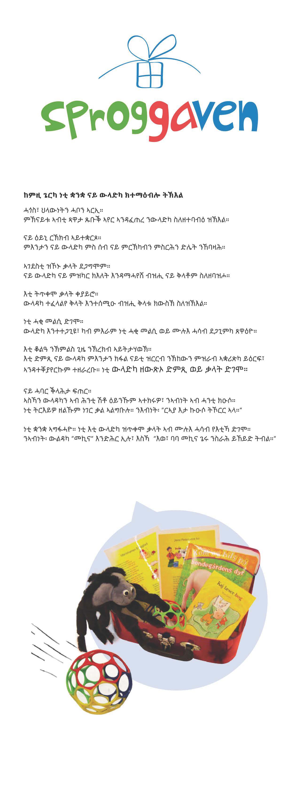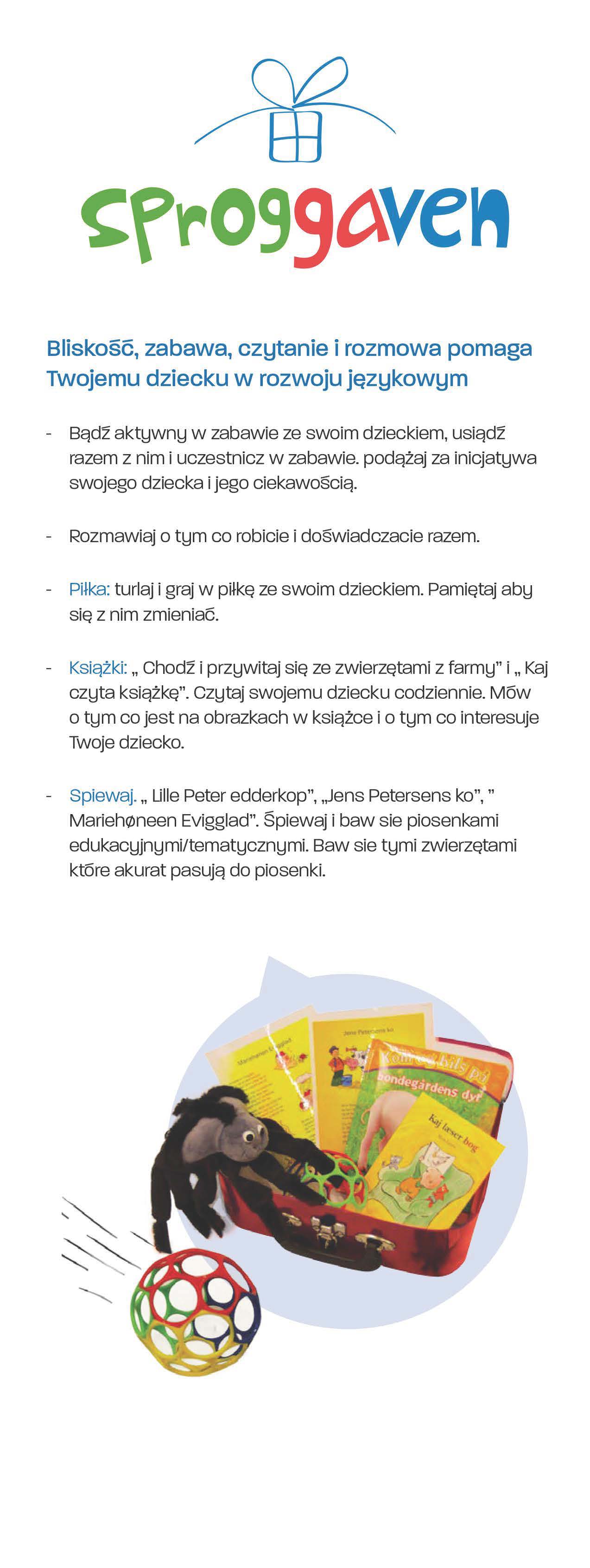 I kufferten findes to bøger, en bold, tre hånddukker og sange, der passer til samt en forældreguide med ideer til brug af materialerne.