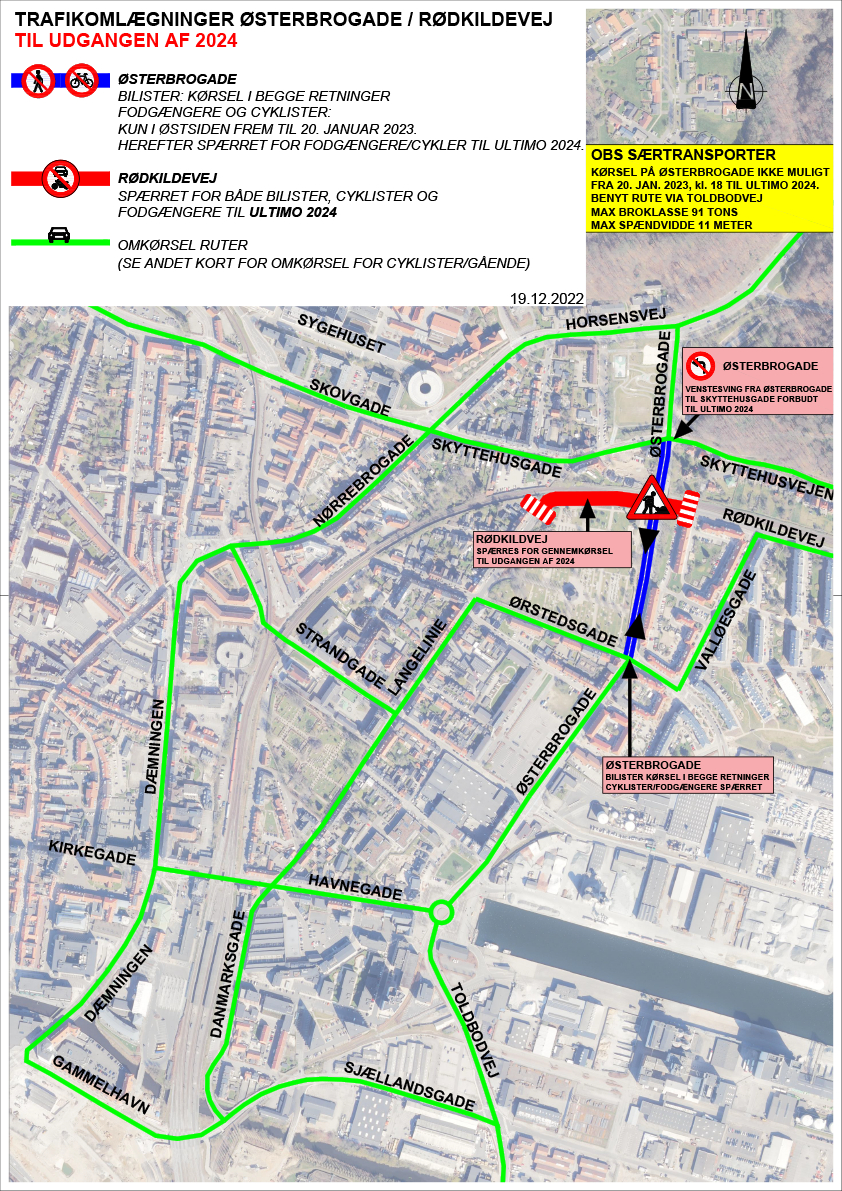 Fra 27. december 2022 og frem til arbejdets afslutning i december 2024 er det ikke muligt for cyklister og gående at benytte Østerbrogade.